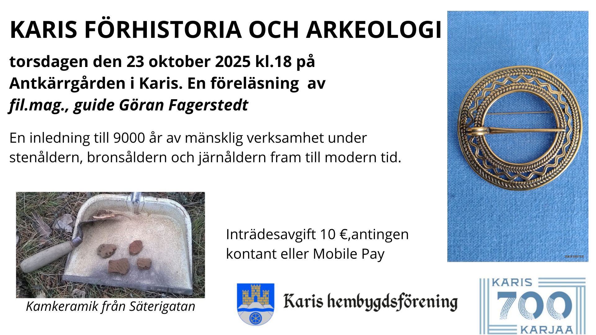 Arkeolog Janne Soisalo berättade om den snörkeramiska tiden ur ett europeiskt perspektiv (på finska) och arkeolog Jan Fast ur ett inhemskt perspektiv (på svenska). 15 personer deltog i föreläsningen som ordnades den 27 november kl. 19.00 på Antkärrgården.