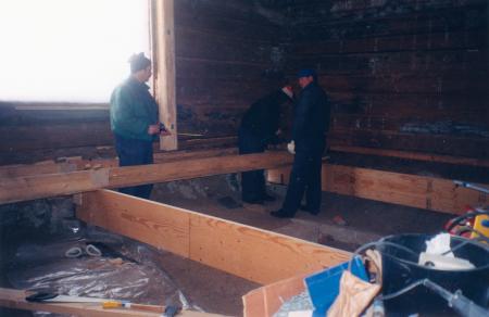 Ämnesord: fotografier, arbetare, män, hembygdsarbete, trä, golvarbete, ombyggnad, balkar, golv, färgfotografering |
