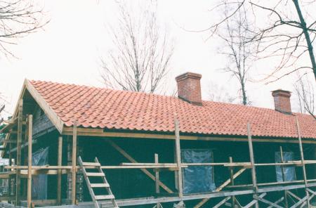 [Fotografi taget av hembygdsföreningens medlem Kaj Waldén - odaterat, men antagligen från maj år 1996. Ackompanjerad av följande bildtexter i albumet:] "Yttertaket lagt".