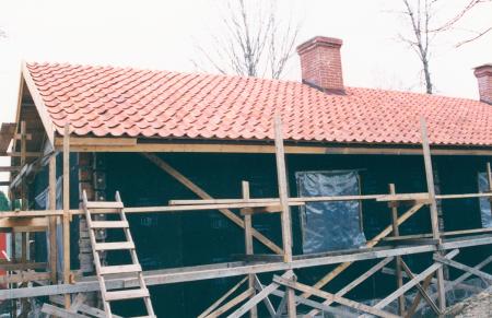 Ämnesord: fotografier, byggnader, hus, trä, timmerbyggnad, tegeltak, fasader, byggnadsställningar, färgfotografering |