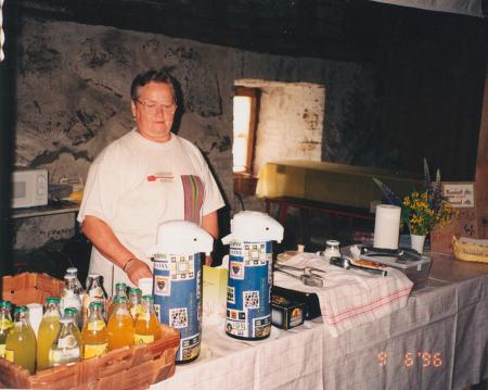 [Foto taget av hembygdsföreningens medlem Berit Björklund under Karisdagen den 9 juni år 1996. Bildtexten lyder:] "Gunnel Sirola i oxstallet i Billnäs säljande kaffe och läsk."