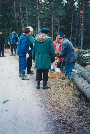 [Foto taget av hembygdsföreningens medlem Berit Björklund den 21 november år 1997. Bildtexten lyder:] "Granristalko för girlander till Karis kurscenter. Hagar Johnsson, Sigvard Baarman, Gunnel Sirola, Rolf Sandström, Kaj Waldén, Anna Back, Anna-Maj Johansson, Åke Baarman, Berit Björklund, Gunda Sandström, Åke Kvarnström, Einar-Olof Lindström och Bertel Sandholm."