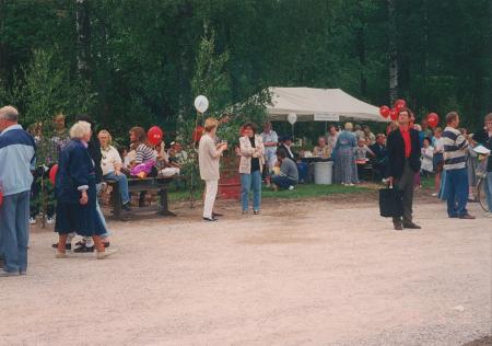 [Foto taget av en okänd person, högst antagligen en medlem av Karis hembygdsförening rf - exempelvis Lars Back eller Kaj Waldén. Bildtexten lyder:] "Invigning av hängbron till Lövkulla 10.6 1995".