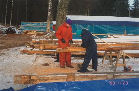 Ämnesord: fotografier, män, hembygdsarbete, höst, snö, stockar, trä, träarbetare, ombyggnad, träbearbetning, reparation, sanering, färgfotografering |