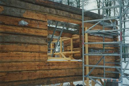 Ämnesord: fotografier, hembygdsarbete, husbyggnad, vår, snö, trä, timmerbyggnad, ombyggnad, byggnadsställningar, färgfotografering |