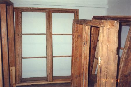 Fotografi taget av fil. lic. Lars Back den 16 februari år 1994. Ackompanjerad av följande bildtext i albumet: "Fönster- och dörrkarmar repareras."