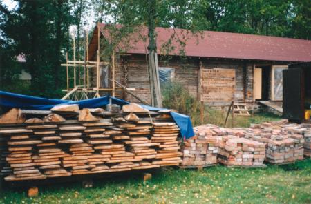 [Fotografi taget av fil. lic. Lars Back - odaterat, men antagligen från år 1995. Ackompanjerad av följande bildtext:] "Nya sågade bräder uppstaplade - Putsade tegel".