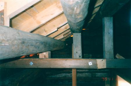 [Fotografi taget av fil. lic. Lars Back den 13 november år 1995. Ackompanjerad av följande bildtext:] "Förstärkning av takstolar".