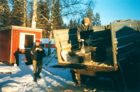 [Foto taget av fil. lic. Lars Back - odaterat, men antagligen från november 1995. Ackompanjerad av följande bildtext:] "Kutterspån sättes på bagarstugans tak som isolering. Arbetsledare Regina Kalenius."