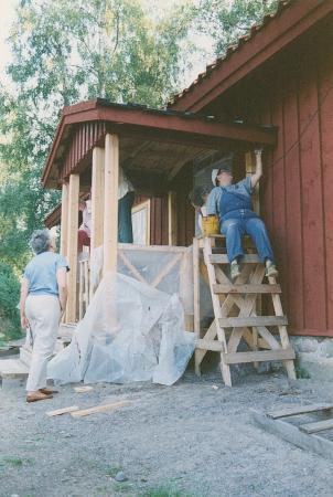 Ämnesord: fotografier, kvinnor, hembygdsarbete, målare, talko, rött, trä, timmerbyggnad, ombyggnad, byggnadsställningar, målningsarbete, färgfotografering |
