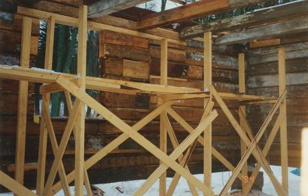 Ämnesord: fotografier, husbyggnad, snö, vinter, trä, timmerbyggnad, fasader, byggnadsställningar, färgfotografering |