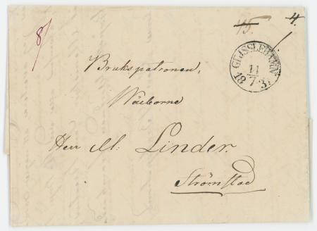 "Brukspatronen, Wälborne Herr M: Linder. Strömstad" - "Grisslehamn 11/7 1873"